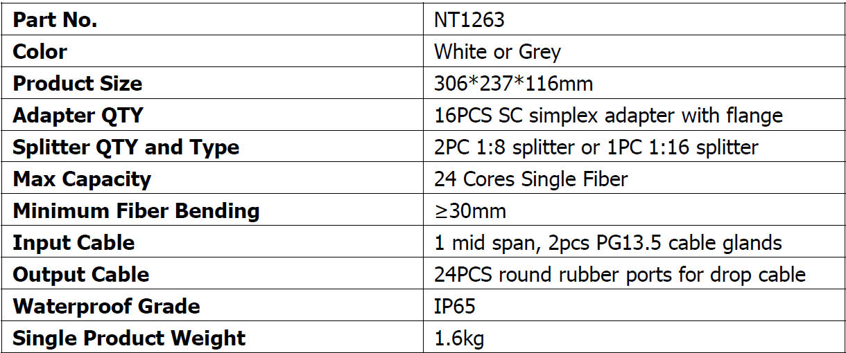 NT1263 Fiber Optical Terminal Box from NEATEL manufacturer is used as a terminal point for the feeder cable to connect with drop cable in telecommunication network system, maximum 16 households end termination. The fiber splicing, splitting, distribution can be done in this box, and meanwhile it provides protection and management for the FTTx network building. Especially the bottom plate and the front cable ports panel is changeable to be round drop cable ports, HUAWEI mini sc adapters, corning opti-tap sc adapters, or sc connectors with waterproof plug as per real construction needs.